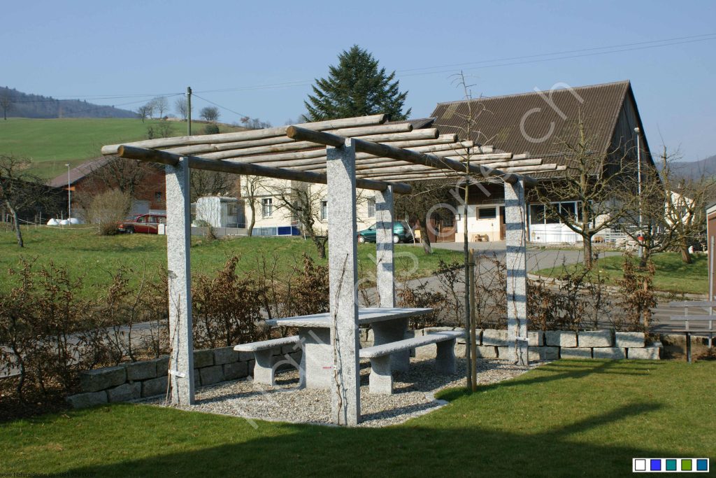Darüber hinaus bietet der Betreiber von Kastanienholz.ch, die Firma NaturalStone.ch auch Granittische für unter die Pergola an. Und auch Palisaden aus Natursteinen.